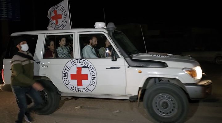 RAFAH, GAZA - NOVEMBER 25: A screen grab captured from a video shows vehicle carrying released Israeli hostages to the Rafah border as part of the exchange agreement during the four-day humanitarian pause in Rafah, Gaza on November 25, 2023. 39 Palestinian civilians will be released by Israel in exchange for the release of 13 Israeli captives from Gaza in addition to seven foreigners outside the framework of the agreement. (Photo by Stringer/Anadolu via Getty Images)