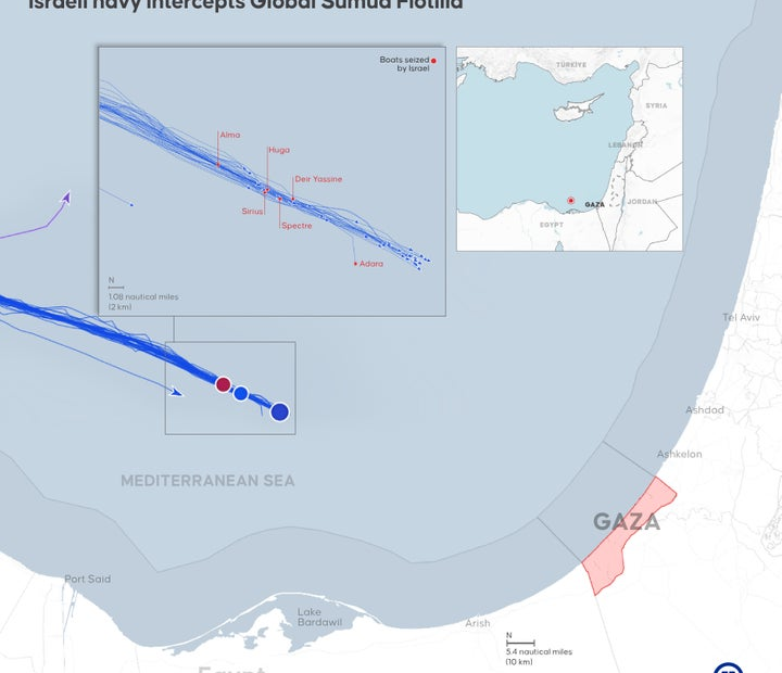 An infographic of the Global Sumud Flotilla shows where the Israeli navy intercepted several of the vessels carrying activists and humanitarian assistance to Gaza, on Oct. 2, 2025.
