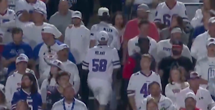 Wearing a souvenir jersey of Bills linebacker Matt Milano, the spectator appeared to abscond with the ball ― mostly a no-no― as he climbed up the soon-to-be-replaced home of the Bills.